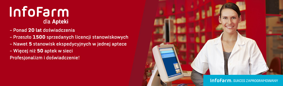 Infofarm dla Apteki posiada wszystkie funkcje, jakie są niezbędne do skutecznego działania apteki na współczesnym, bardzo konkurencyjnym rynku farmaceutycznym. Poprzednik systemu, DOS-owy program Infofarm Apteka cieszył się popularnością w południowo-wschodniej i południowej Polsce.Infofarm dla Apteki przełamuje ten schemat i staje się podstawowym narzędziem pracy aptek rozproszonych na terenie całego kraju. Wśród rosnącego grona użytkowników są apteki i sieci aptek, zlokalizowane w województwach: mazowieckim, lubelskim, podkarpackim, małopolskim, na Górnym i Dolnym Śląsku, w Wielkopolsce, w województwie zachodniopomorskim, pomorskim oraz kujawsko-pomorskim.