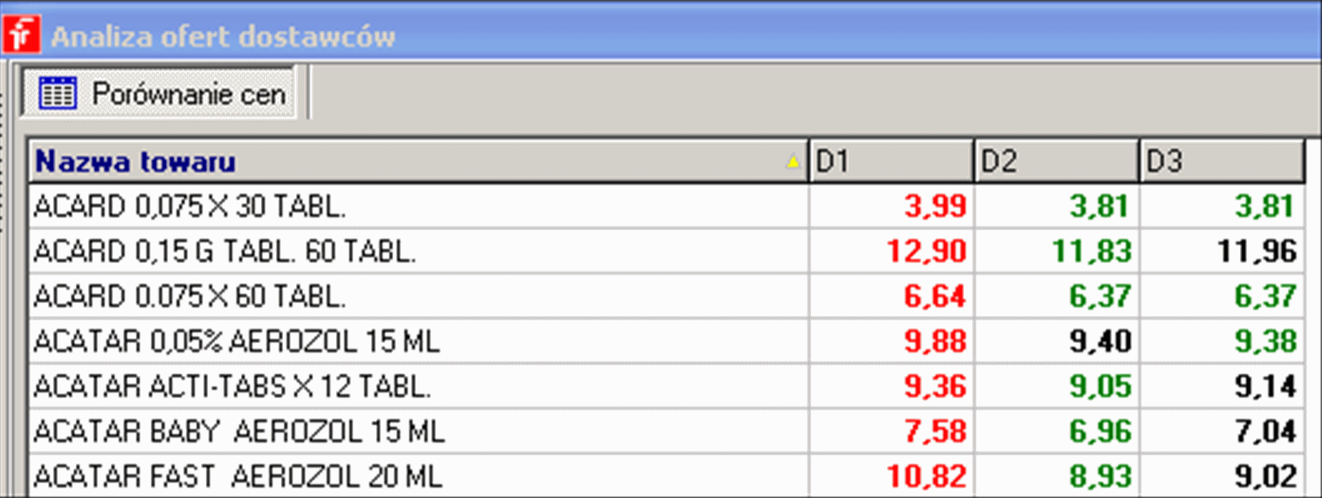 Dobre ceny i wysoka rentowność sprzedaży Trudna sztuka podejmowania decyzji cenowych dla produktów nierefundowanych jest dużo łatwiejsza dla użytkowników programu Infofarm dla Apteki. Symulator marży ułatwi Ci określenie postulowanych poziomów marż dla poszczególnych grup asortymentowych, pozwalających osiągnąć oczekiwany poziom zyskowności. W Cenniku będziesz miał dostęp do wszystkich informacji potrzebnych do określenia ceny/marży dla poszczególnych towarów: postulowana marża, cena u konkurencji, cena sugerowana przez dostawcę/producenta, cena zakupu, ilościowa , prognoza sprzedaży. Infofarm dla Apteki zaoferuje Ci pełną swobodę w zakresie stosowanych technik kalkulacji cen - marża procentowa, kwotowa, mieszana, progresywna, degresywna, cena decyzyjna niezależna od ceny zakupu, cena urzędowa. Analiza ofert dostawców pozwoli Ci kupować, po najlepszej na rynku cenie, natomiast dzięki Zamówieniom pakietowym kupisz produkty nie tylko w dużo lepszej cenie, ale i w ilościach odpowiednich do Twoich możliwości sprzedażowych. W Dostawach uzyskasz pełną kontrolę nad cenami zakupu – poprzez kontrolowanie zgodności dostaw z zamówieniem/ofertą i wychwytywanie każdej istotnej podwyżki. |